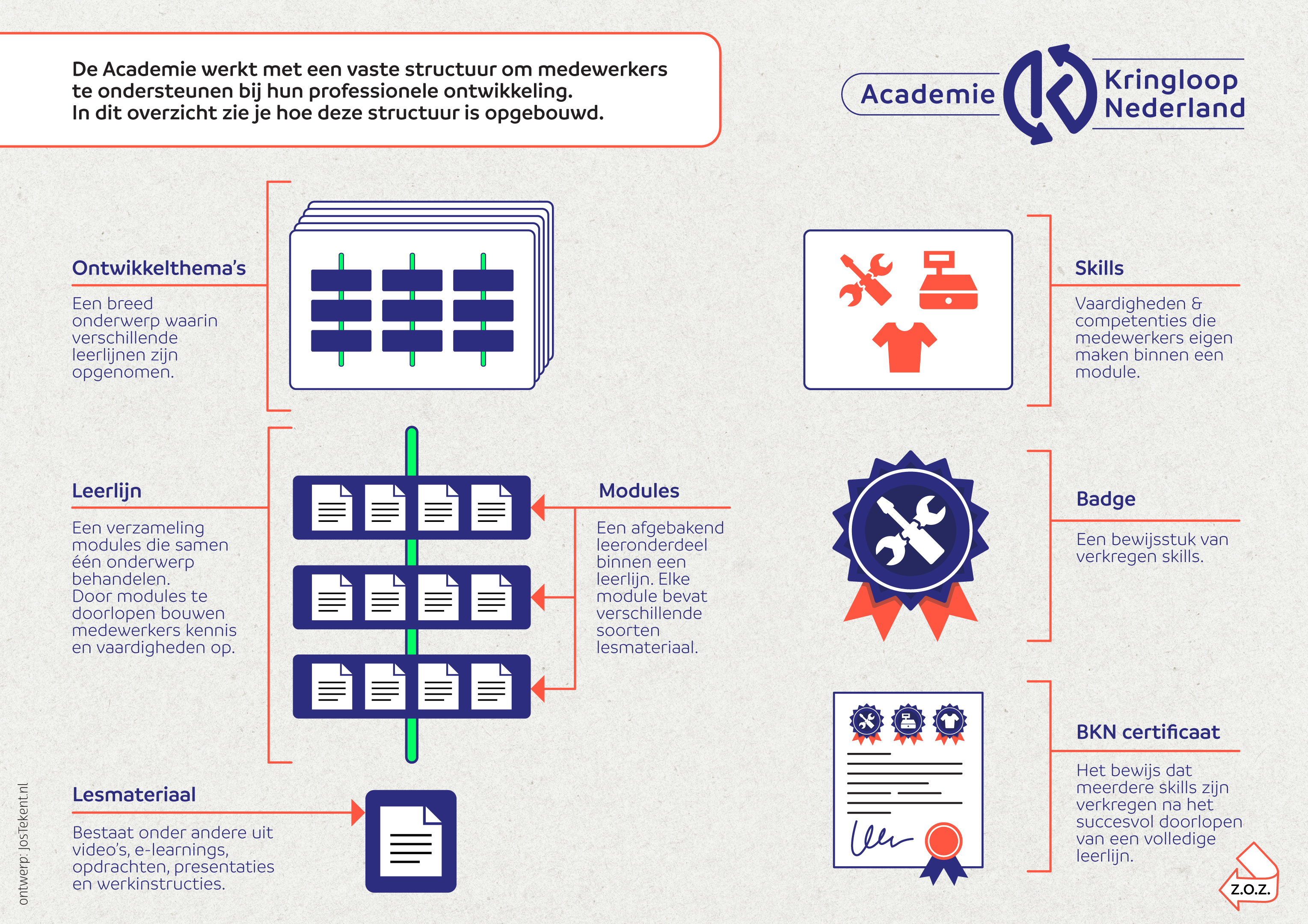 De Academie werkt met een vaste structuur om medewerkers te ondersteunen bij hun professionele ontwikkeling. Momenteel is de inhoud van de Academie ondergebracht in drie ontwikkelthema’s waarin verschillende leerlijnen zijn opgenomen. Een leerlijn is een verzameling modules die samen één onderwerp behandelen. Door modules te doorlopen, bouwen medewerkers hun kennis en vaardigheden op. Een module is een afgebakend onderdeel binnen een leerlijn. Elke module bevat verschillende soorten lesmateriaal. Na het doorlopen van een module ontvangen medewerkers een badge en na het doorlopen van een leerlijn een certificaat.